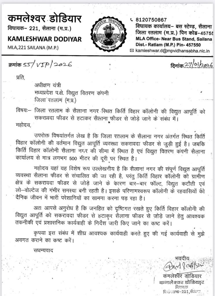 RATLAM -SAILANA सैलाना नगर स्थित कीर्ति विहार कॉलोनी की विद्युत समस्या को लेकर सैलाना विधायक कमलेश्वर डोडियार ने अधीक्षण यंत्री, मध्यप्रदेश पश्चिम क्षेत्र विद्युत वितरण कंपनी, जिला रतलाम को पत्र लिखकर त्वरित समाधान की मांग की है। विधायक डोडियार ने पत्र क्रमांक 55/VIP/2026 दिनांक 27 जनवरी 2026 को भेजते हुए कीर्ति विहार कॉलोनी की विद्युत आपूर्ति को सकरावदा फीडर से हटाकर सैलाना फीडर से जोड़ने का अनुरोध किया है।_