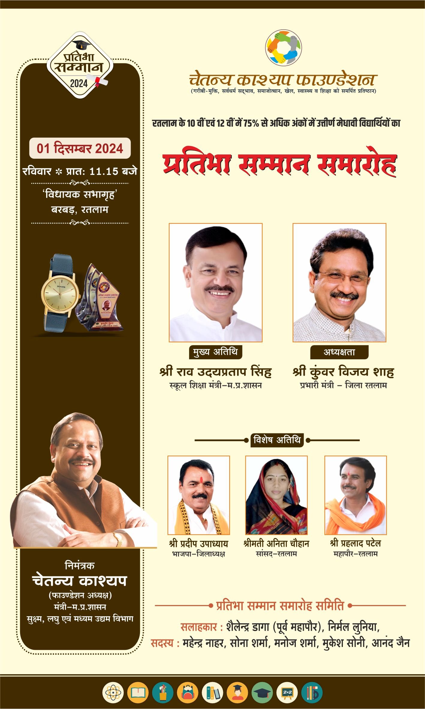 रतलाम। चेतन्य काश्यप फाउंडेशन द्वारा 1 दिसंबर, रविवार को प्रतिभा सम्मान समारोह आयोजित होगा, जिसकी तैयारियां पूर्ण हो चुकी है। मेधावी विद्यार्थियों का सम्मान मुख्य अतिथि प्रदेश के स्कूल शिक्षा मंत्री राव उदयप्रताप सिंह एवं अध्यक्षता कर रहे जिले के प्रभारी मंत्री विजय शाह द्वारा किया जाएगा। कार्यक्रम में फाउंडेशन अध्यक्ष एवं सूक्ष्म, लघु एवं मध्यम उद्यम मंत्री चेतन्य काश्यप भी उपस्थित रहेंगे। इस अवसर पर सांसद अनिता चौहान, महापौर प्रहलाद पटेल एवं भाजपा जिलाध्यक्ष प्रदीप उपाध्याय विशेष अतिथि रहेंगे।