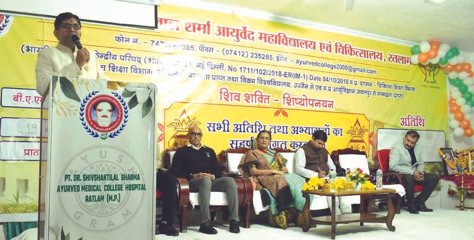 रतलाम। पं. डॉ. शिवशक्तिलाल शर्मा आयुर्वेदिक चिकित्सा एवं महाविद्यालय, आयुष ग्राम बंजली, रतलाम में दो दिवसीय शिष्योपनयन कार्यक्रम का आयोजन हुआ। इस कार्यक्रम के प्रथम दिवस मुख्य अतिथि शासकीय मेडिकल कॉलेज की डीन डॉ अनिता मूथा, संस्था चेयरमैन डॉ अभिजीत देशमुख, आरोग्य भारती के राष्ट्रीय कार्यकारिणी सदस्य मिहिर कुमार की उपस्थिति में हुआ। सर्वप्रथम दीप प्रज्जवलन के उपरांत समस्त अतिथियों का स्वागत किया गया।